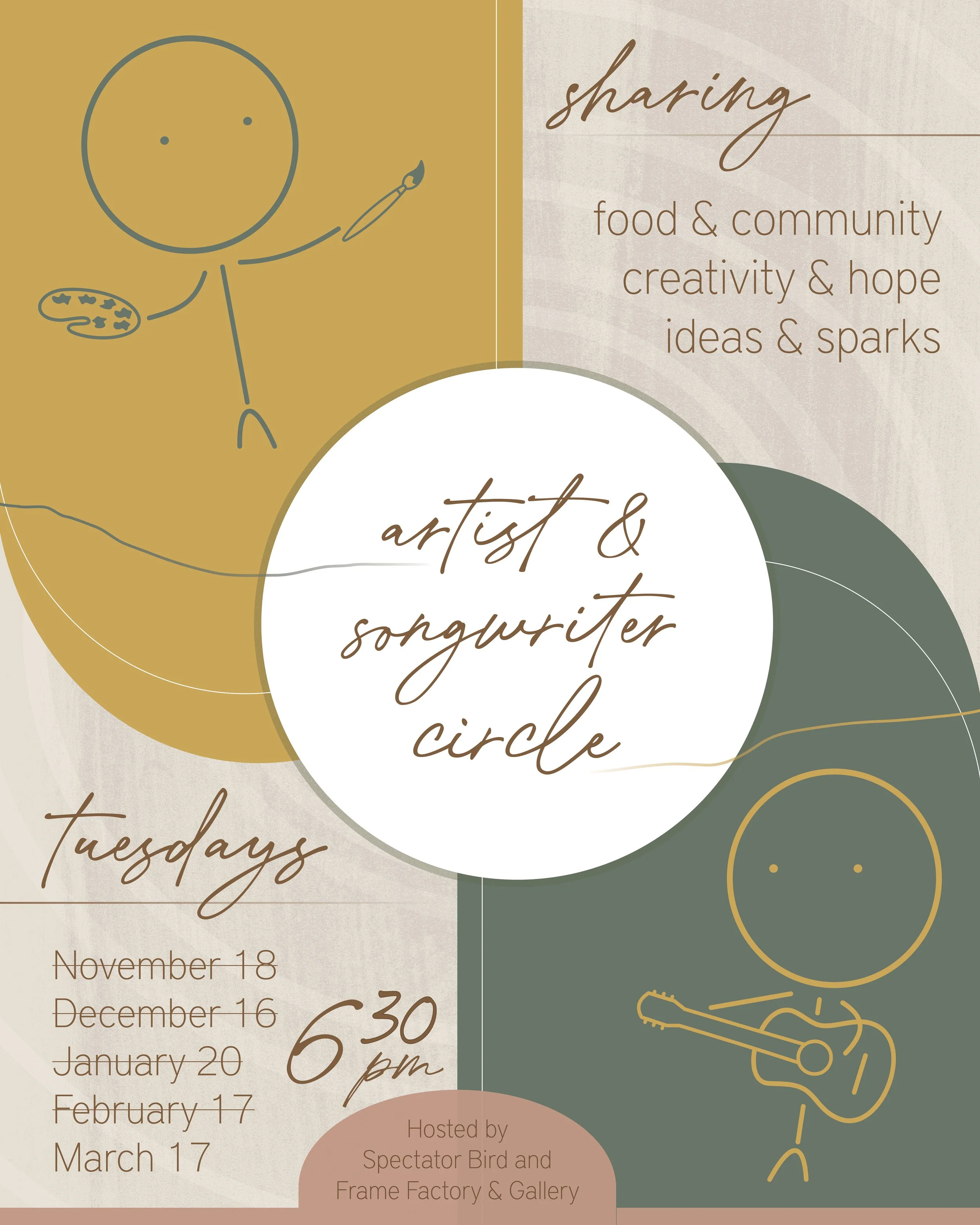 Join us for a special Artist & Songwriter Circle every third Tuesday at 6:30 pm during the fall and winter months. We believe art and music are essential to living well and we need to support each other to keep creating! Bring something you’re working on, enjoy delicious food, and meet some new friends.